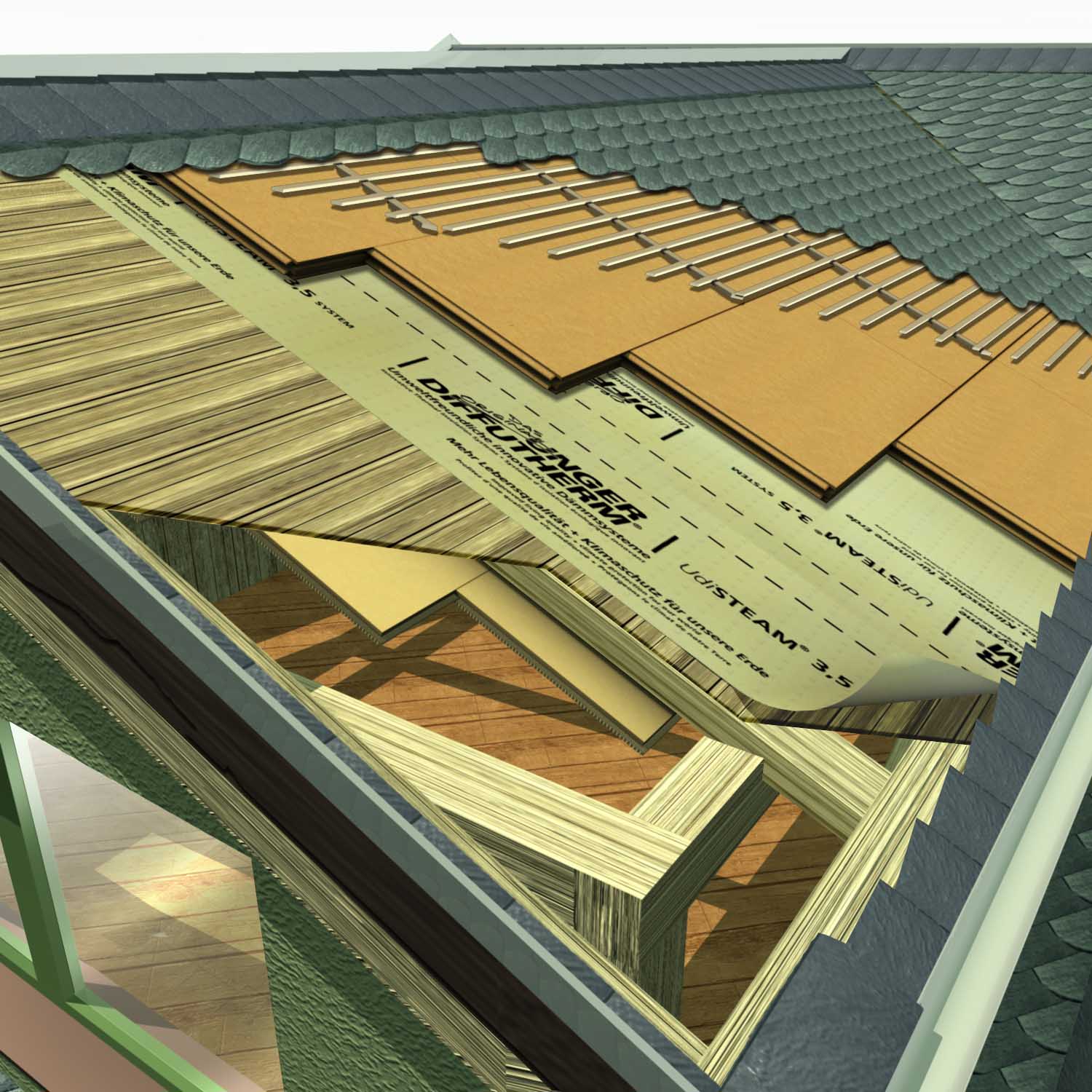 C’est un système fonctionnelle , durable ,et perspirant , à la fois isolant et ouvert à la diffusion, irréprochable du point de vue de la physique du bâtiment pour une isolation optimale de la toiture, qu’il s’agisse d’une isolation sur toiture ou sur chevrons.